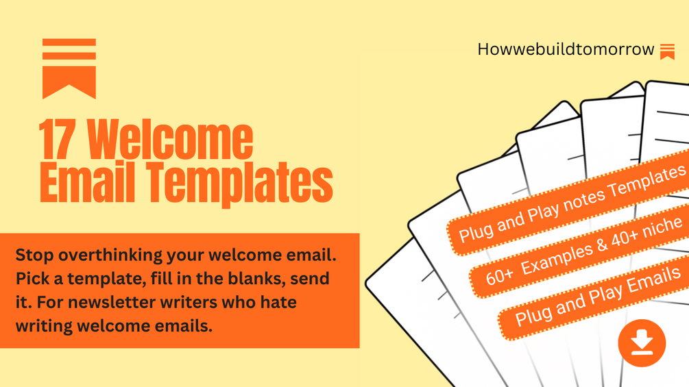 17 Welcome Email Templates (Fill-in-the-Blank) Stop overthinking your welcome email. Pick a template, fill in the blanks, send it. Includes: 17 different approaches (not 17 versions of the same thing) 60+ examples from 40+ niches 119 subject line options All under 7 lines Designed to get replies For newsletter writers who hate writing welcome emails